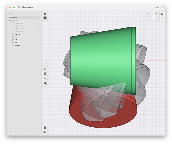 I’m trying to make a chute for an object to drop through. At the end of the chute I want to change its orientation when it comes to a final stop. In the photos, I marked the start location and orientation of the part in green and the final placement is in red. This model is showing the travel of the part and will be subtracted from the full model to form the chute.