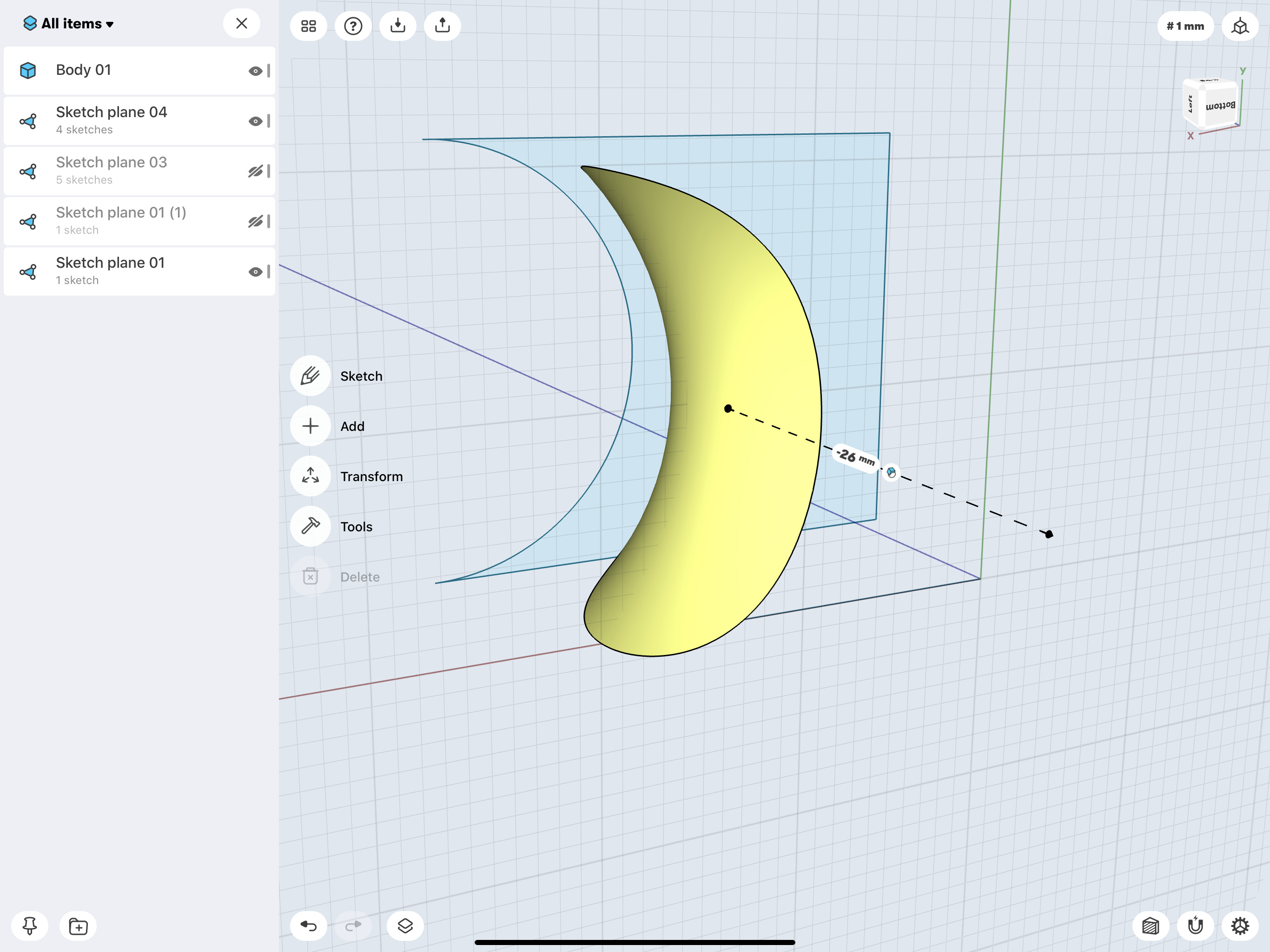 Iām glad this was helpful. I literally just started using this app so donāt know exactly why construction plane appears on the opposite side, but my guess is that it is because the front side of the model is exactly that side where construction plane is appearing (see the 3D cube, the closes side to you is saying Back.) Good news the method will work anyway so select construction plane, double-tap on it, and build a sketch on it.